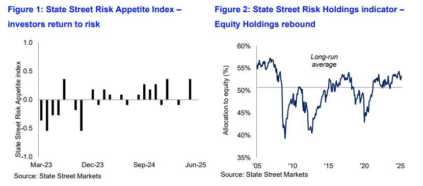 The State Street Risk Appetite Index rose to 0.36 at end-May. The State Street Holdings indicators show that long-term investor allocations to equities rose anew in May to levels last seen just before the 2 April tariff announcement.