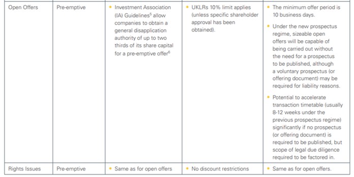 If issuers are to make use of the higher threshold for when a prospectus needs to be published then, in the majority of cases, some form of pre-emptive offer structure (open offer or rights issue) will need to be used by them in light of 10 per cent +10 per cent limit on disapplication authorities included in the Pre-emption Group (PEG) Guidelines on the Disapplication of Pre-emption Rights (the PEG Guidelines) which listed companies are expected to follow. Companies that need to raise larger amounts of capital more frequently (so-called “capital hungry companies” under the PEG Guidelines) will be able to seek larger disapplication authorities from their shareholders provided that the reasoning for exceeding the above limits is specifically highlighted at the time that the request for a general disapplication is made. IPO candidates should disclose in their IPO prospectus if they intend to be a “capital hungry company.”
